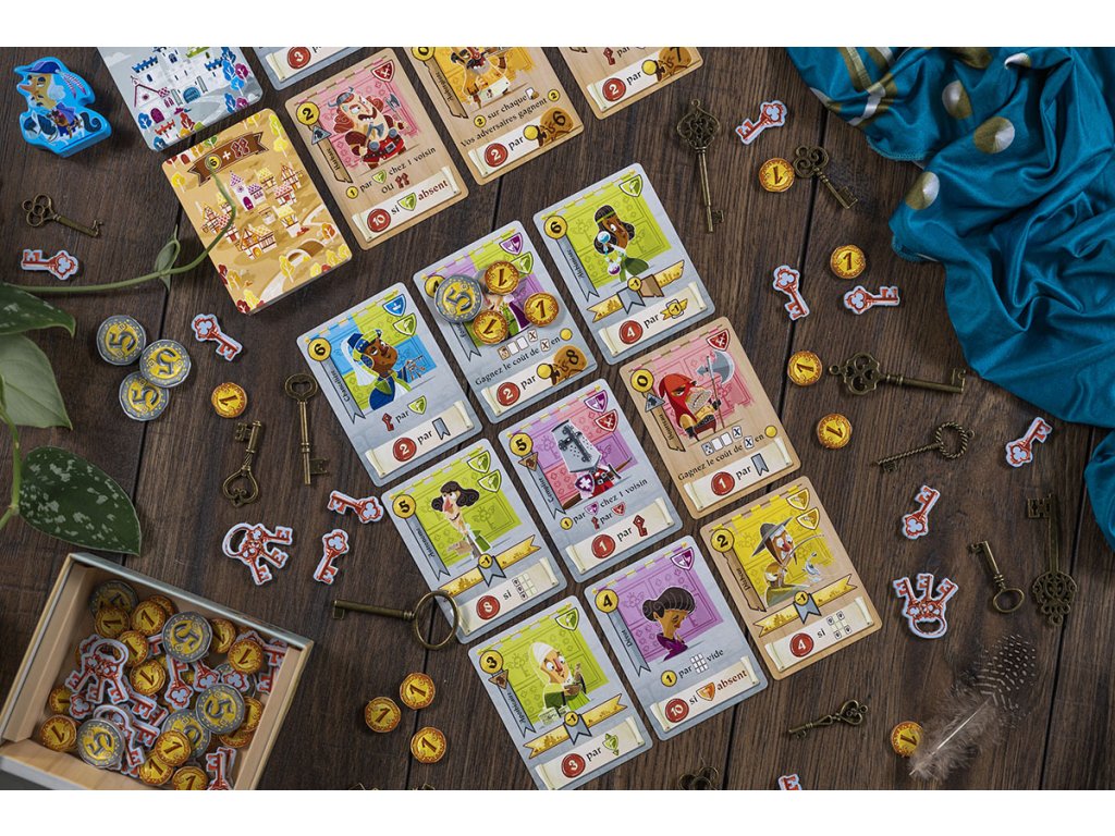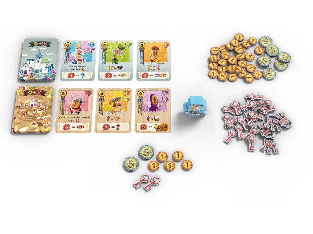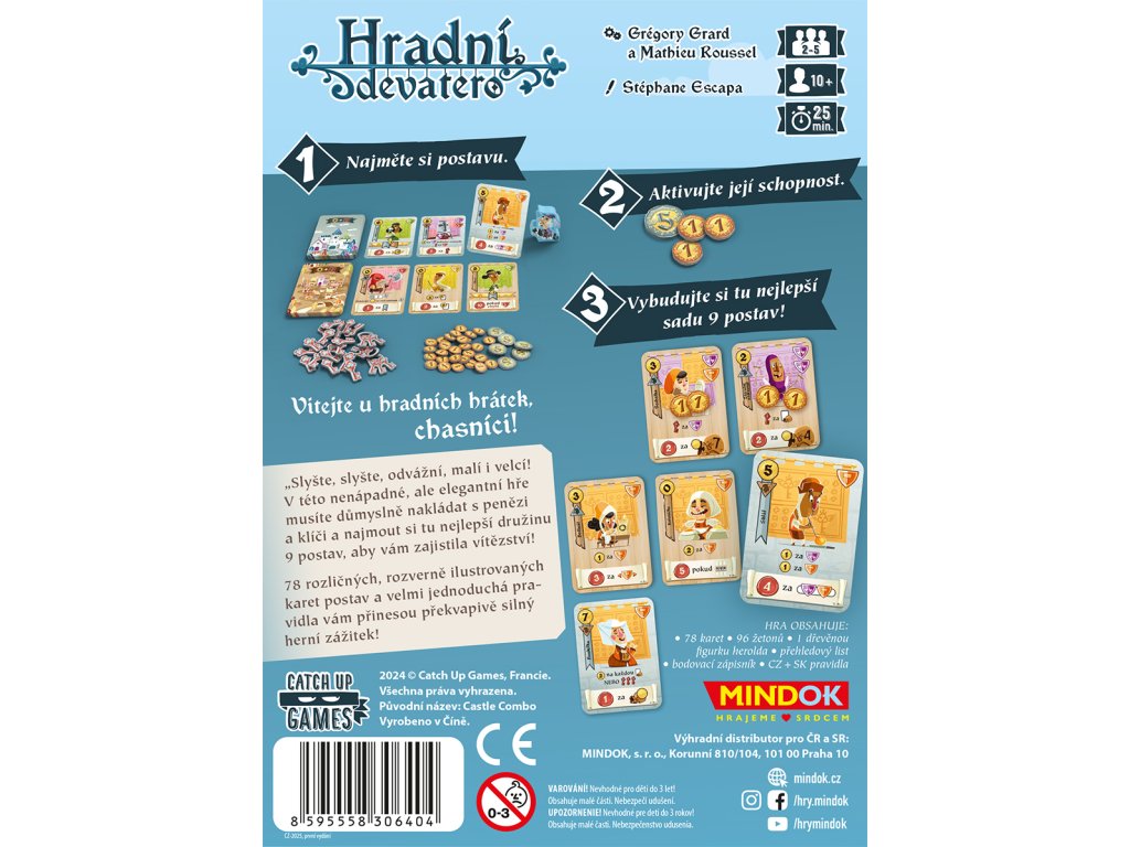Hradní devatero je rychlá a chytrá karetní hra, ve které si hráči skládají své devatero postav. V každém kole do svého čtverce 3x3 karet přidají jednu kartu ze dvou dostupných nabídek – horního a dolního města. Budou při tom dobře hospodařit s penězi, karty mají nějakou, a navíc se právě na synergii mezi kartami, které jim dokážou přinést spoustu vítězných bodů. Záleží třeba na barvách karet, na tom zda jsou zlaté či stříbrné a samozřejmě také na pozici karty. Hradní devatero se hodně povedlo, jedná se o moc hezky se kombící hru!
